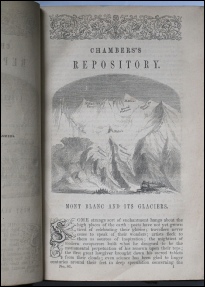 Chamber's Repository. MONT BLANC AND ITS GLACIERS. with 'A VISIT TO THE HIMALAYAS'. William and Robert Chambers. 1854 vols. XI and XII pp32 & 32. engraved vignettes, one of Mont Blanc and Chamouni. bound together with other tracts. half calf gilt raised bands, marbled boards, rubbed. Very Good- £125