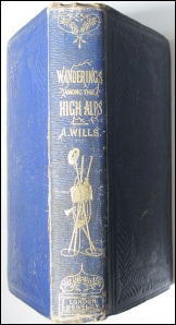 Wills A. WANDERINGS AMONG THE HIGH ALPS. Richard Bentley. 1856 1st. pp384. 4 tinted lithographs (foxed) illustrations 2 of the 'Ascent of the Wetterhorn', 'Night Encampment on the Mer de Glace', 'View from the Gumihorn'. original blind stamped blue cloth spine decorated gilt. sl. rubbed and hinges weak. Very Good- £395